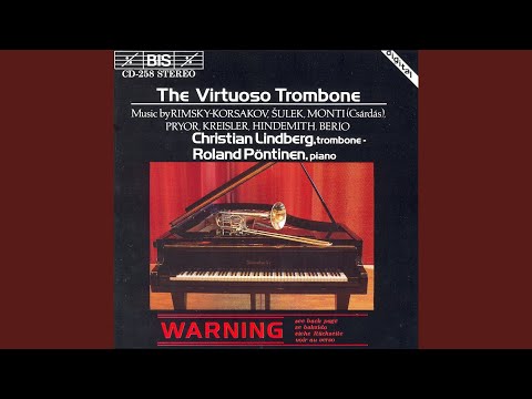 I first heard Sequenza V in the early 90s, when I picked up Christian Lindberg's 1984 CD, The Virtuoso Trombone. The Berio is the final track; before that comes an appropriately diverse selection of serious and lighter fare (Hindemith and Martin, alongside Arthur Pryor's variations on The Blue Bells Of Scotland and Lindberg's frankly ridiculous double-tongued version of The Flight Of The Bumble-Bee). This impressive performance of the sequenza is one of the fastest on record: he gets through the whole thing in just 5'18". As a result, the quickfire exchanges of the first part are thrillingly dynamic, almost suggesting a second player. The slower-moving B section is also immaculate, particularly when it comes to managing the tricky balance between the sung and the played.